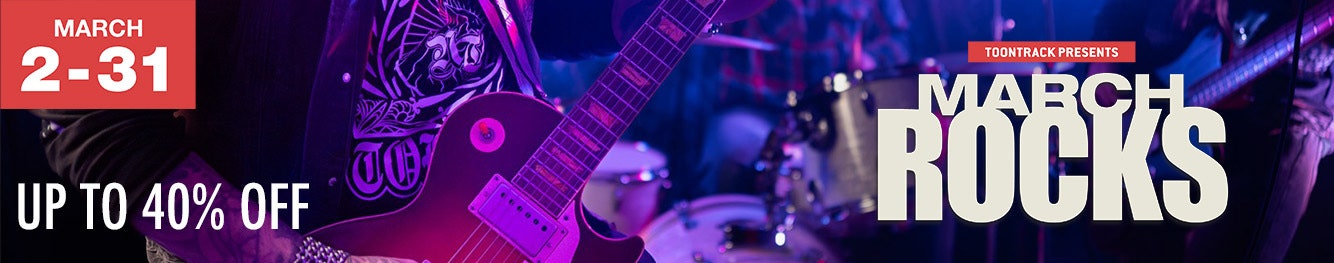 Nu rockar vi in våren med Toontracks March Rocks-kampanj. Under en begränsad tid får du 20–40 % rabatt på ett stort urval av expansions och pluggar för EZdrummer, Superior Drummer, EZbass, EZkeys och EZmix.