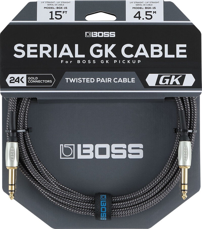 The BGK cable series delivers optimum performance with BOSS guitar synthesizer products that support the Serial GK digital interface, including the GK-5/GK-5B pickups and GM-800 module. Premium BOSS construction features include braided shielding, 24K gold-plated connectors, and a woven outer jacket for tangle-free use.