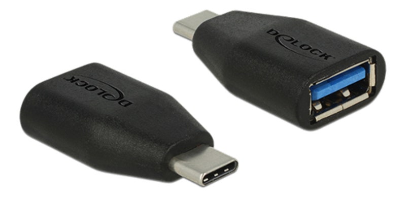 Denna adapter från Delock kan användas för ansslutning av en USB-enhet med USB-C gränssnitt och en USB-A port av standardtyp.