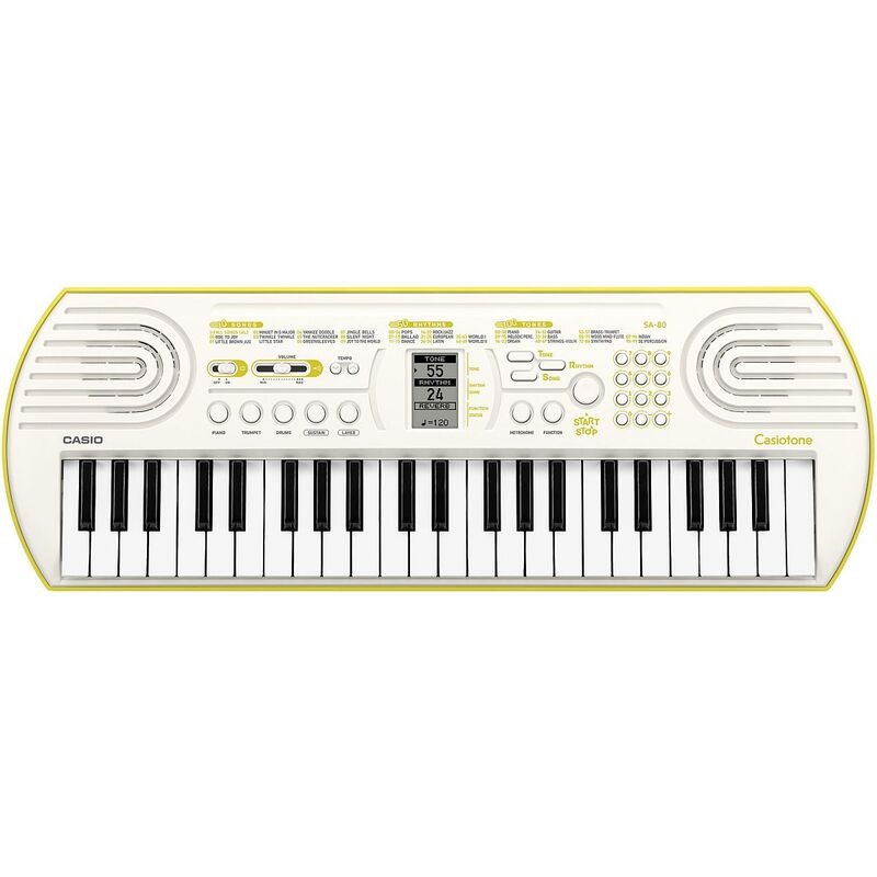 Casio SA-80 är ett kompakt keyboard med 44 tangenter, utvecklat som ett första instrument för nybörjare och yngre spelare. Modellen kombinerar grundläggande ljud, rytmer och pedagogiska funktioner i ett lättanvänt format.