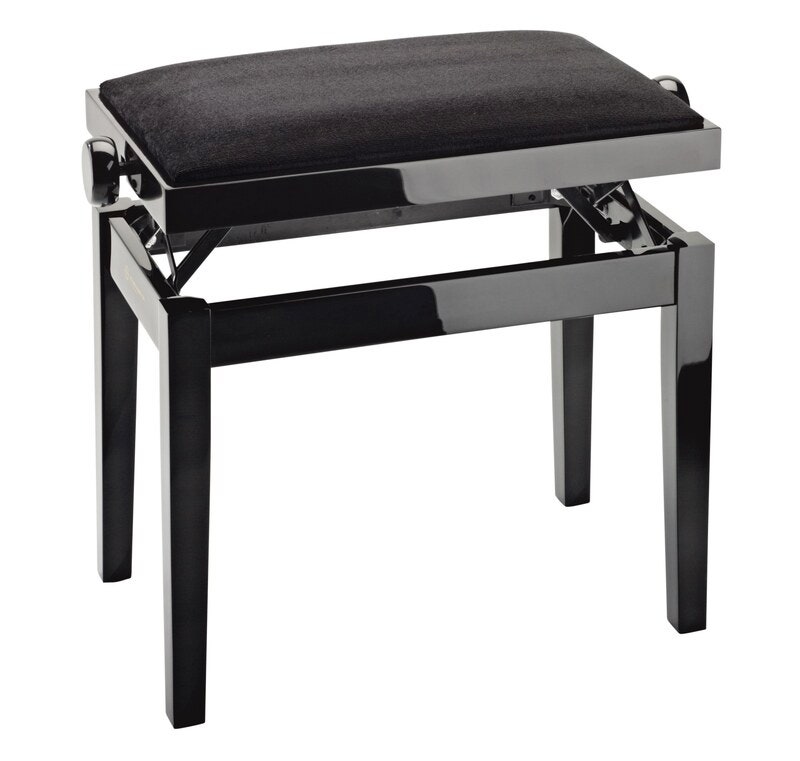 Complete piano bench of solid European beech wood, varnished with four coats of black glossy polyester finish.