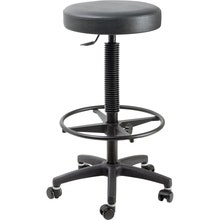 Hög pall för gitarristen, pneumatisk höjdjustering, fotstöd, låsbara hjul, rund sits i konstläder, svart.