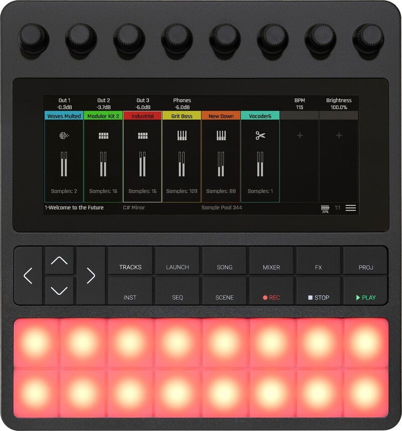 Artikelnummer 1091196Sampler/synth/sequencer, 7" pekskärm, 16 pads, 24-bit ljud, scenbaserad sequencer, stereo in/ut, USB-C, MIDI in/ut via Mini-TRS, inbyggt batteri 3h