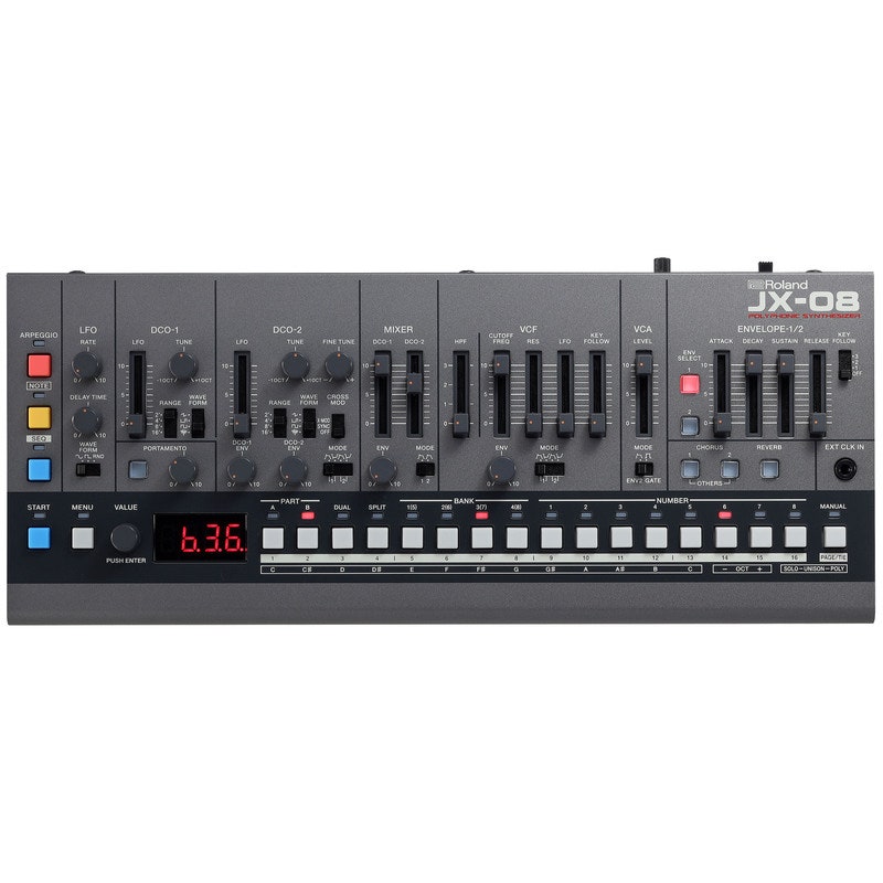 1985 tog Rolands innovativa JX-8P-modell hybridsyntesen ett steg framåt med en ny spännande analog-digital röst. Instrumentet blev snabbt populärt bland ledande studiomusiker som ofta använde dess varma pads, skimrande chorus och kristalliska strukturer i periodens mest populära låtar. JX-08 introducerar på nytt det unika ljudet hos denna eftertraktade klassiker med fantastisk detaljrikedom i kombination med kraftfulla nya effekter, en polyfonisk sequencer med mera. Och för att förstärka ditt kreativa flöde finns en fullmatad panel med fysiska kontroller hämtade från programmeringsenheten PG-800 för den ursprungliga hårdvaran.