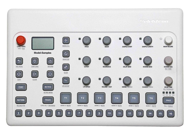 Artikelnummer 1073315B-Stock, Samplebaserad groovebox, 6 ljud- och MIDI-spår, Elektron-sequencer med upp till 64 steg per spår, anslagskänsliga pads, USB-audio 2.0 och balanserade utgångar, full garanti