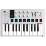 Artikelnummer 1096421B-Stock, Kompakt vit MIDI-controller med 25 anslagskänsliga slim-keys, RGB-pads, djup DAW-integration, USB-C och MIDI-ut samt omfattande mjukvarupaket för direkt musikskapande.