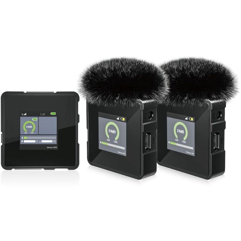 Trådlöst mikrofonsystem, 2,4 GHz digital sändning, 50 m räckvidd, 24-bit/48 kHz ljud, LCD-display, USB-C laddning, upp till 6 timmars batteritid, dubbel sändare/mottagare