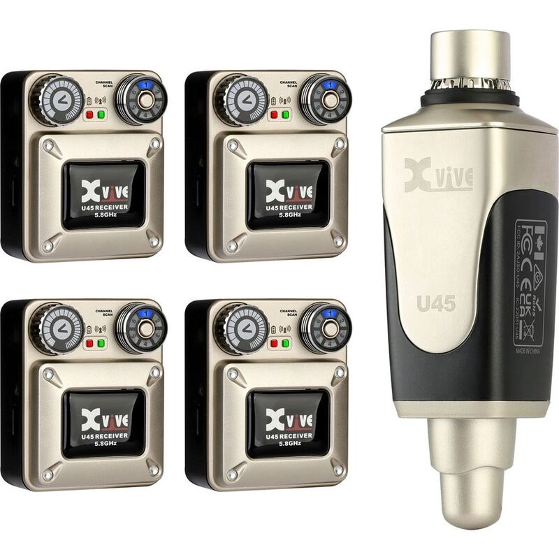 Xvive U45R4 är ett digitalt trådlöst in-ear-monitoreringssystem som arbetar på 5,8 GHz-bandet. Systemet levereras med en sändare och fyra mottagare, vilket gör det möjligt att koppla upp flera användare samtidigt. Mottagarna är byggda i metall och har en lättåtkomlig volymkontroll samt en kraftfull hörlursförstärkare.