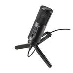 Ideal for podcasting, home studio recording, field recording, and voiceover use, the ATR2500x-USB plugs into your computer or other device, and functions seamlessly with your favorite recording software. This large-diaphragm, side-address cardioid condenser reduces pickup of unwanted sounds from the sides and rear, and is equipped with a high-quality analog-to-digital converter (24-bit, up to 192 kHz) for excellent fidelity. The mic also has a headphone jack with up/down volume control buttons for direct audio monitoring. The ATR2500x-USB comes with two 2 m (6.6') cables (USB-C to USB-C, USB-C to USB-A), a sturdy tripod desk stand, and a pivoting threaded stand mount that attaches securely to the supplied tripod or to a conventional microphone stand.