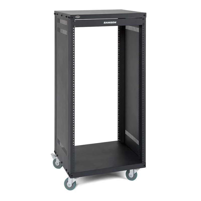 Stabil rackvagn i plåt med låsbara 75mm gummihjul. Ena sidan har rackskenor med europeisk-, andra med amerikansk skruvgänga. Heltäckande plåtsidor med ventilationshål.
