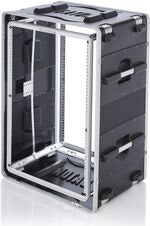 Robust rackkonstruktion i 16U-format med integrerat stötskydd och ventilation. Utformad för att skydda känslig utrustning vid transport och användning i krävande miljöer.