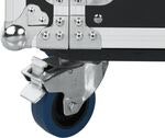 Rackväskan har fyra fasta hjul med en diameter på 4 tum, varav två är låsbara för säker positionering. Handtagen är försänkta och gummerade med fjäderbelastning för att underlätta bärning och hantering, samtidigt som de skyddar mot skador vid transport.