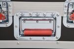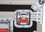 Tillverkad av 9 mm plywood med laminerad utsida och förstärkta metallhörn. Locket är gångjärnsförsett för enkel åtkomst och insidan är klädd med grå filt för skydd av innehållet.