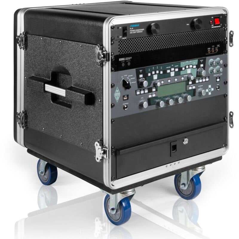 Denna 10U rackbas är framtagen för att monteras under Gator GRC-seriens konsolrack eller andra standardrack. Med fyra hjul, varav två är låsbara, möjliggör den smidig transport och flexibel användning i både fasta installationer och mobila sammanhang.