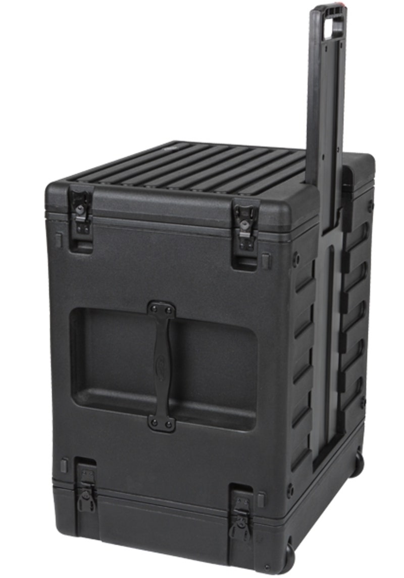 8U Roto Rolling Rack, incorporating an innovative new design that includes the one-touch pull handle and back lid mounted wheels for easy transport. Roto Rolling Racks will easily stack with our existing standard and shallow racks. Four military grade butterfly latches secure each lid with an internal rubber gasket that keeps water out so sensitive electronics stay safe and secure in transport.