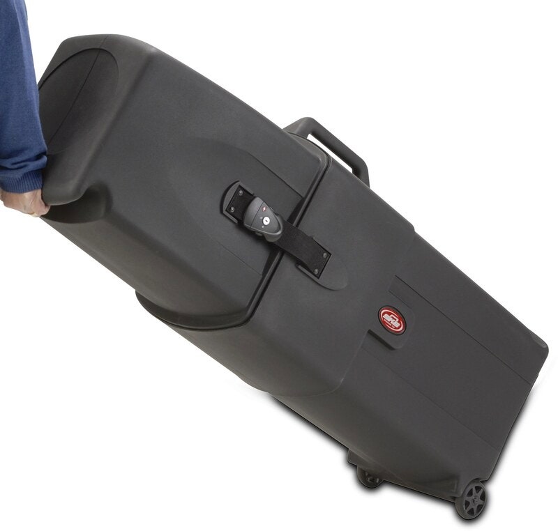 Robust stativ- & hardware-etui med hjul. Modellen står på högkant med överskjutande lock. Vid utlastning finns en smidig klack att hålla emot med foten om det går trögt när lådan är välfylld.