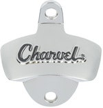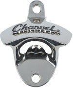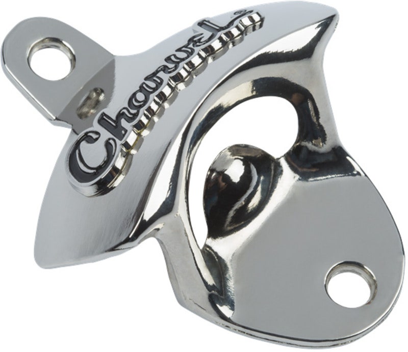 Chrome wall mount bottle opener with Charvel® "toothpaste" logo. Easily mounts to any stable surface. Hole spacing is 2.5"