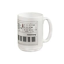 Vit keramisk kaffemugg med Moog-design, svart logotyp och klaviaturmotiv, ca 325 ml kapacitet, tålig för...