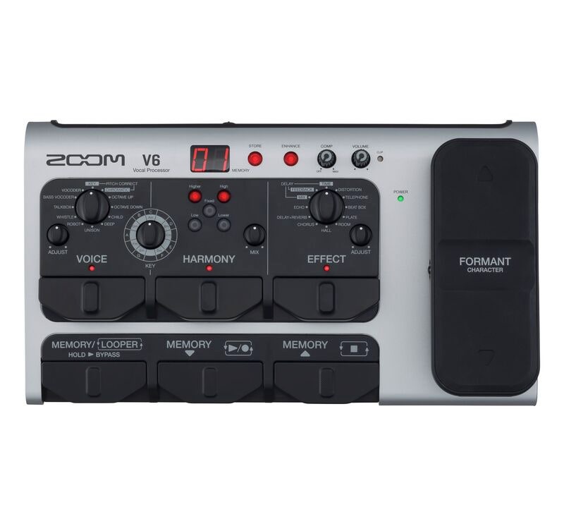 Den är fullpackad med professionella sångeffekter och färdiginställda patches, en inbyggd looper och zooms nya Format Pedal. V6:an kan användas rakt ut ur lådan, eller ge oändliga ljudkreationer. Pedalen är indelad i tre olika effektsektioner och placerat ergonomiskt i två rader för att göra effektbyten lika enkelt som att trampa takten.