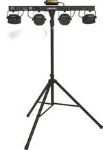 Artikelnummer 1091313Multieffektbar, 2x LED PAR, 2x Derby RGB, röd/grön laser, 4 stroboskop, DMX upp till 27 kanaler, IR-fjärr, power-chaining, höj- och sänkbart stativ, bärväska, IP20