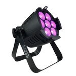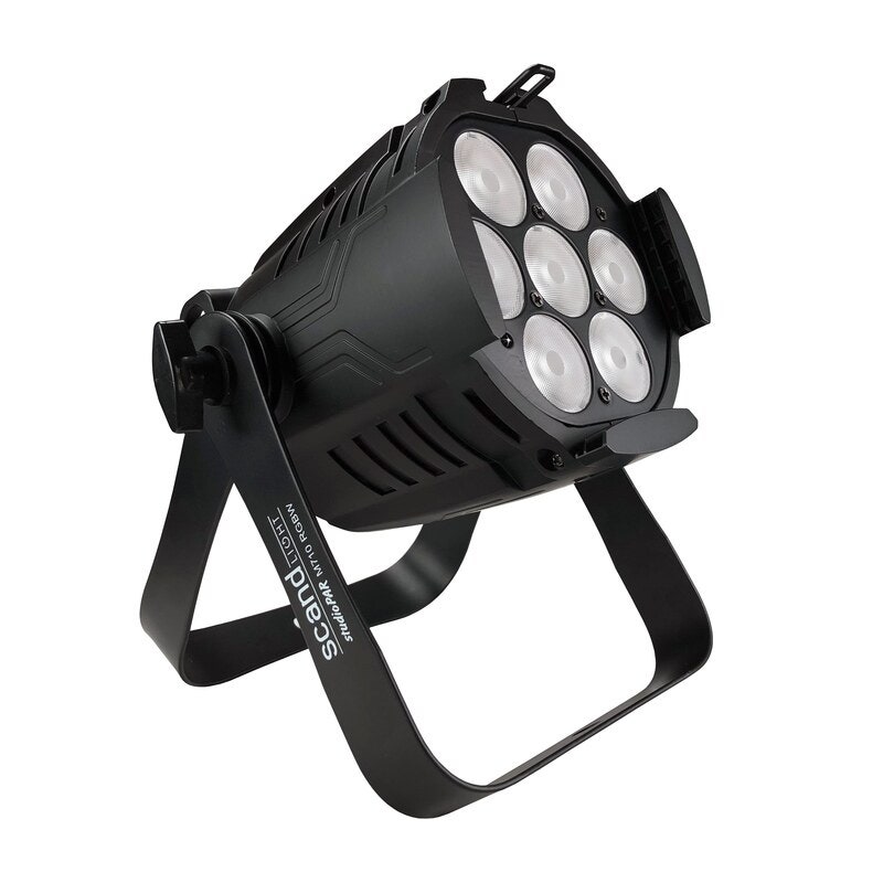 En kraftfull och snygg mini studio ljudarmatur i läcker design ifrån Scandlight. Chassit är gjutet i aluminium och armaturen är utrustad med hela 7st urstarka 10W RGBW LED-dioder. Scandlight studioPAR M710 RGB+W kan köras i DMX, Auto, Master/Slave eller i ljudstyrnings läge. Kan med enkelhet styras via den medföljande fjärrkontrollen. Armaturen är otroligt ljusstark trots sin smidiga storlek. Mängder av inställningsmöjligheter och användningsområden. Den tysta fläkten gör att den passar extra lämpligt till lokaler där det ska vara tyst i. Passar perfekt för att färgsätta väggar, lokaler, studios, band, scener mm.