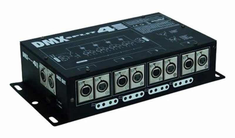 DMX-splitt med 4st 3-pol utgångar. Ett måste för dig som är trött på att dra DMX kablar i långa längder fram och tillbaks.