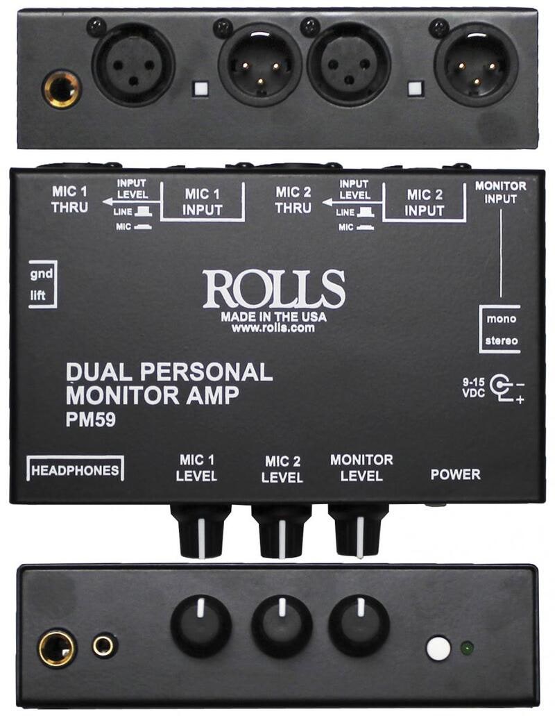 The PM59 mixes one or two microphones with a line-level Monitor signal to a set of headphones. The microphone inputs can be configured for standard mic level or line level XLR. The PM59 has a monitor level control, mic/XLR level control for each channel, mic/line pass through output XLR jacks for both channels, two headphone output jacks, and a stereo or mono TRS or TS 1/4" monitor input jack. The PM59 is designed for recording, podcast, keyboard players, drummers who need to hear a click track, choir singers who need to hear themselves, and many other applications. Power adapter is included with the PM59.