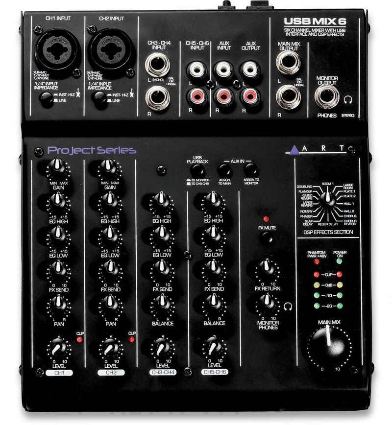 The ART USBMIX6 Microphone, Instrument, and Line Mixer / Computer Interface is a compact versatile audio interface for your computer that converts analog signals from a variety of audio sources to a digital audio. The built-in low latency stereo digital effects add to the versatility. It can also be used as a standalone mixer through the main mix outputs. The USBMIX6 provides a great starting point for personal home studio recording or for anyone wanting to do mobile location recording. Use the USBMIX6 to record podcasts, capture your latest idea for a song, make voiceovers for your home movies, or record a jam with a friend – whenever and wherever your creativity takes you!