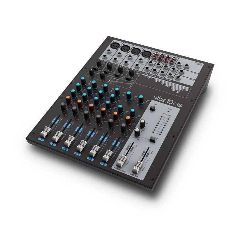The VIBZ 10 C is a versatile mixer with four balanced microphone inputs featuring high quality preamplifiers, a low-cut filter and switchable phantom power. Two microphone inputs are equipped with inserts for individual signal processing, two more can alternatively be used as stereo line channels.
