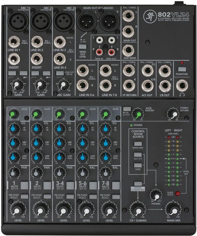 Mackie 8-kanals mixer med 3 st onyx preamps och 8 linjeingångar med högt headroom. AUX send med egen volym och panorering för varje kanal. Stereo AUX retur för effekterna.