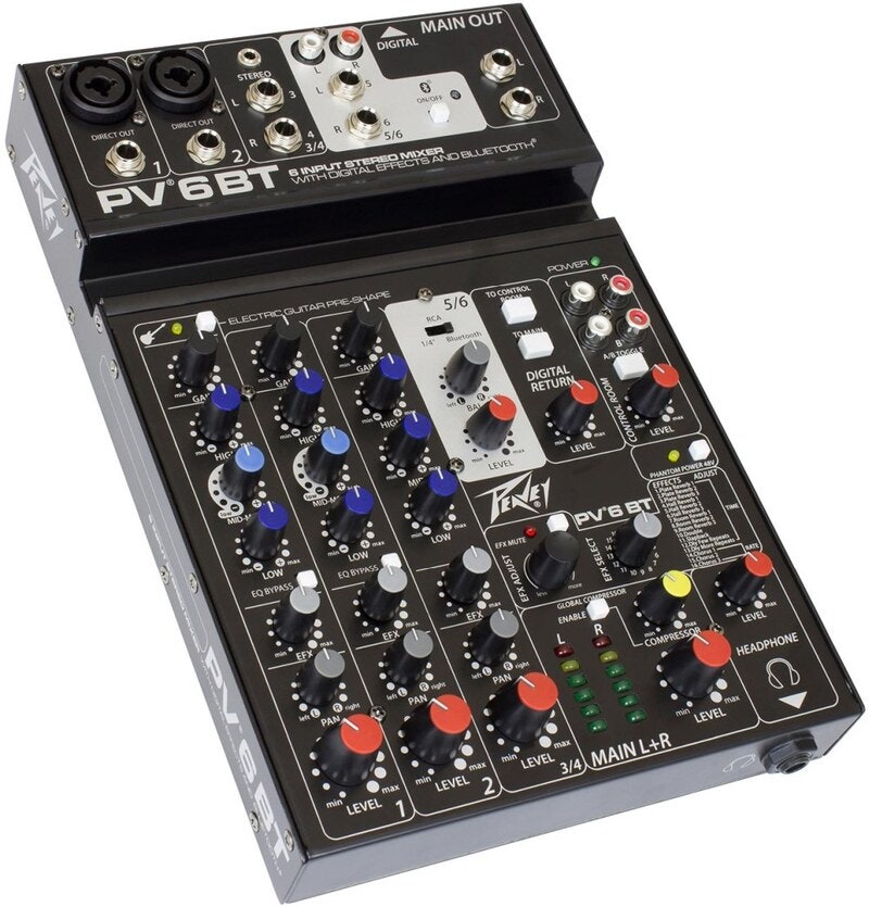 The PV 6 BT mixer includes 2 channels of reference-quality mic preamps, 2 direct outputs for recording, a stereo input channel, and a dedicated media channel, and Bluetooth® wireless input and high quality digital effects. Other features include 48 volt phantom power, dual selectable control room outputs, built-in stereo compressor, an on-board selectable high impedance preamp equalized for guitar, 3-band EQ per channel with bypass, signal/clip indicators, and a stereo master LED meter bridge.
