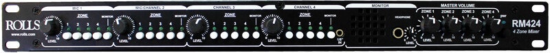 RM424 Four Zone Mixer combines two paging microphones with two line level source inputs. Each input is switch selected to output to any combination of four zone outputs. The outputs are all balanced XLR connectors, Remote Volume provides each zone with the means for external volume control. The Microphone inputs feature selectable ducking for paging. Front panel speaker makes pre assignment monitoring for each channel possible with individual switching for each channel. The RM424 is easy for anyone to use from the front, but from the rear it is just complex enough it will fill even the most demanding four zone installation requirements.