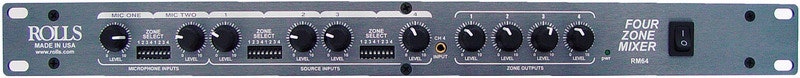 Rackmonterbar 4-zons mixer för 2 mikrofoner och 4 line-källor. Varje ljudkälla kan kopplas till valfri kombination av fyra zoner. Talkover-funktion för valfri mikrofoningång.