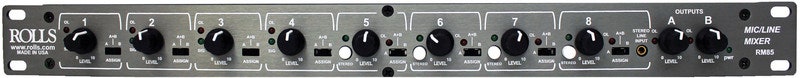 The RM85 is a 8 channel two zone mixer. Channels 1-4 will accommodate XLR microphone or XLR line level inputs. Channels 5-8 are 1/4" inputs. All 8 channels can be sent to the two XLR outputs in three configurations; A, B or both A+B. The separate A and B outputs are XLR and either can be selected to be Line or Microphone level output. Channel 8 also has a stereo 3.5mm (1/8") input on the front of the RM85.