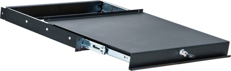 Utdragbar rackhylla med extra rackskenor för stabil montering i bakkant eller sidan av rack. 1HE.
