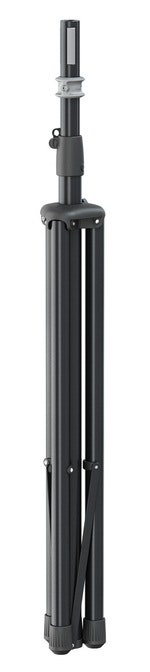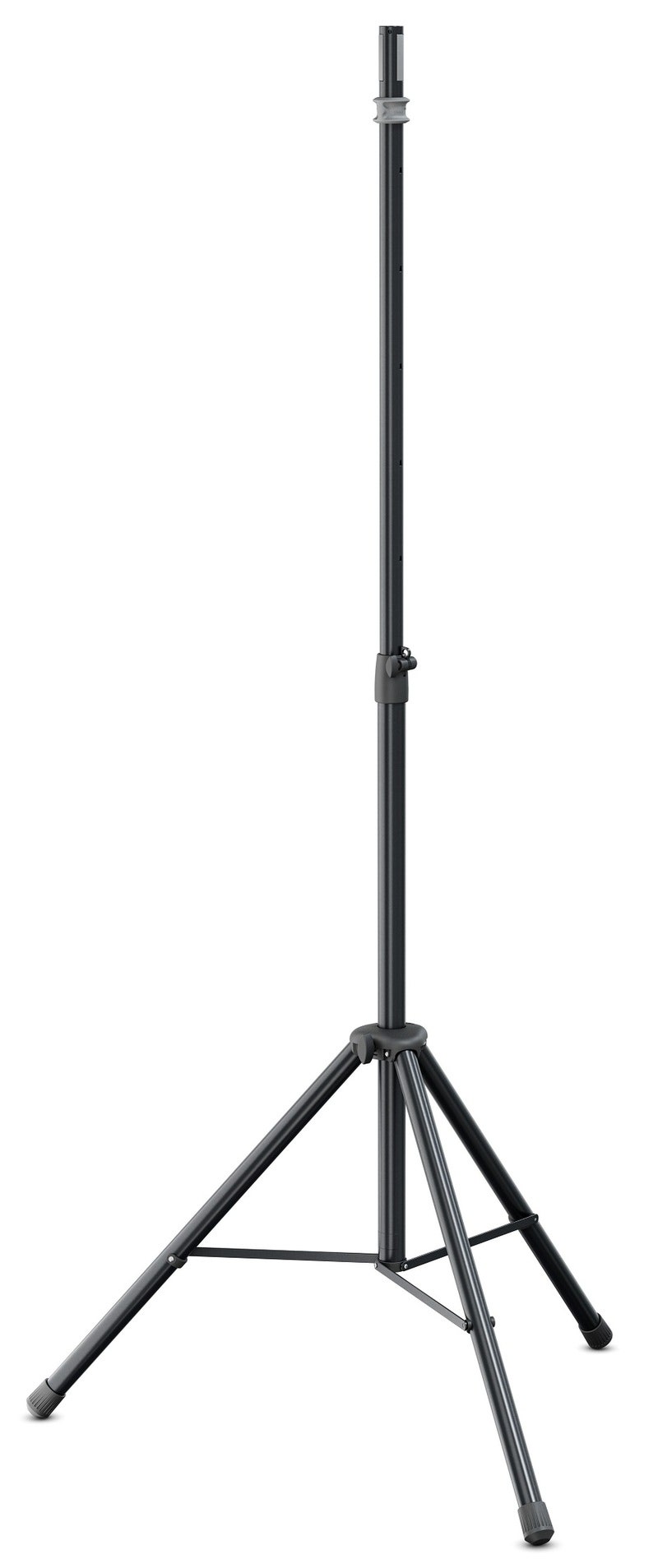A patented expanding mandrel with quick-release fastener ensures a tight fit of the speaker cabinet. The plastic expansion splints ensure a vibration-free connection between the speaker cabinet and the tube. The height of the steel stand ranges from 1,417 to 2,117 mm, is fixed with a safety hook and secured by a clamping screw for a vibration-free and firm fit. Other features include a pull-out guard for the extension tube, an integrated shock absorber and durable powder coating.