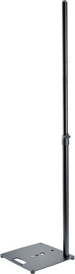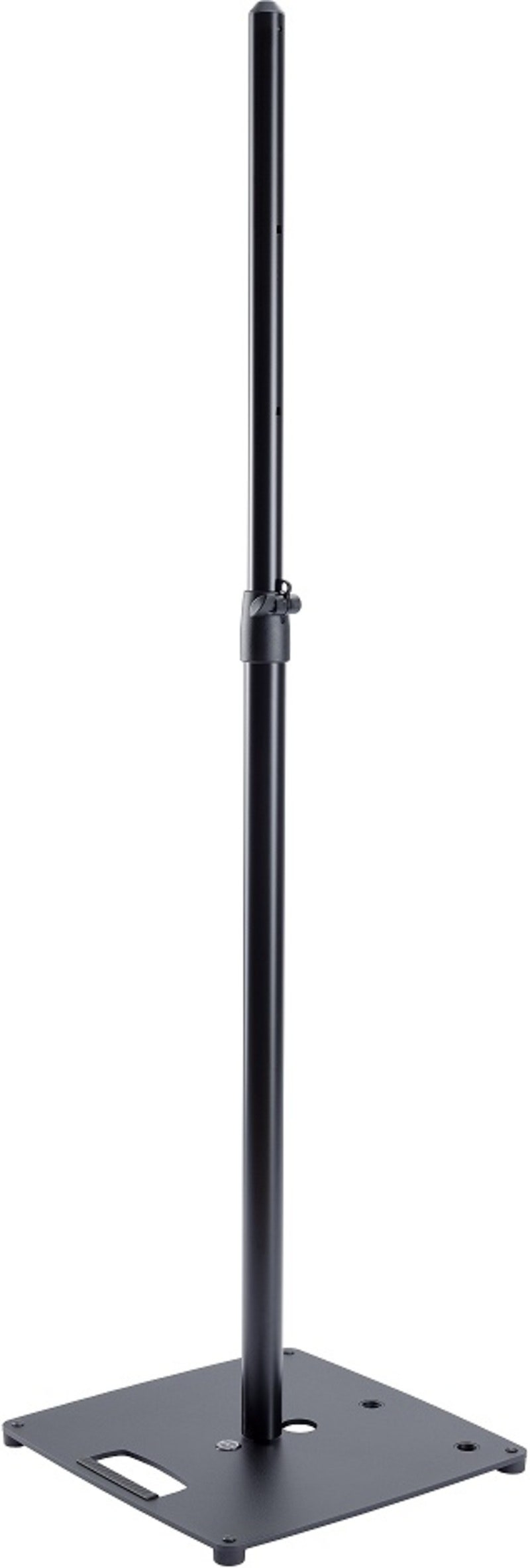 Elegant högtalarstativ med platt stativfot (406 x 406 mm) samt bärhandtag och inbyggd kabelhantering. Stativet är idealiskt för användning vid begränsat utrymme. Beroende på krav finns det tre sätt att placera stativpinnen. Förutom det centrerade och off-center-läget kan stativpinnen även monteras i hörnen på stativfoten. Höjd mellan 1110 och 1810 mm och kan justeras i 4 steg à 175 mm. Den maximala lastkapaciteten är 18 kg.