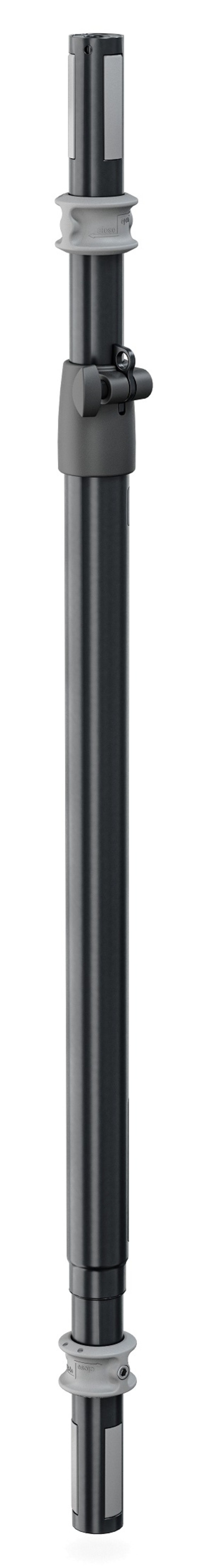 Steel tube combination for use in subwoofers with flange adapter. The height is fixed with a safety hook and secured by a clamping screw for a vibration-free and firm fit. The slim design of the clamp allows space-saving transport and ensures a stylish appearance. The usable height is between 1,005 and 1,505 mm and is adjusted in 5 steps of 100 mm. Integrated on both sides is a patented expanding mandrel with quick-release fastener, which ensures a tight fit of the subwoofer and the satellite speaker. The plastic expanding splints also ensure a vibration-free connection between the speaker and the tube.