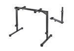 The practical universal holder opens up new application possibilities for the »Omega« 18810 and 18820 keyboard stands as well as for the 18950 and 18953 table-style keyboard stands. The holder is steplessly adjustable in height and distance and can be mounted individually on any supporting leg of a keyboard stand. As an option K&M offers the sheet music holder 18805, various tablet PC holders as well as all common microphone boom arms.