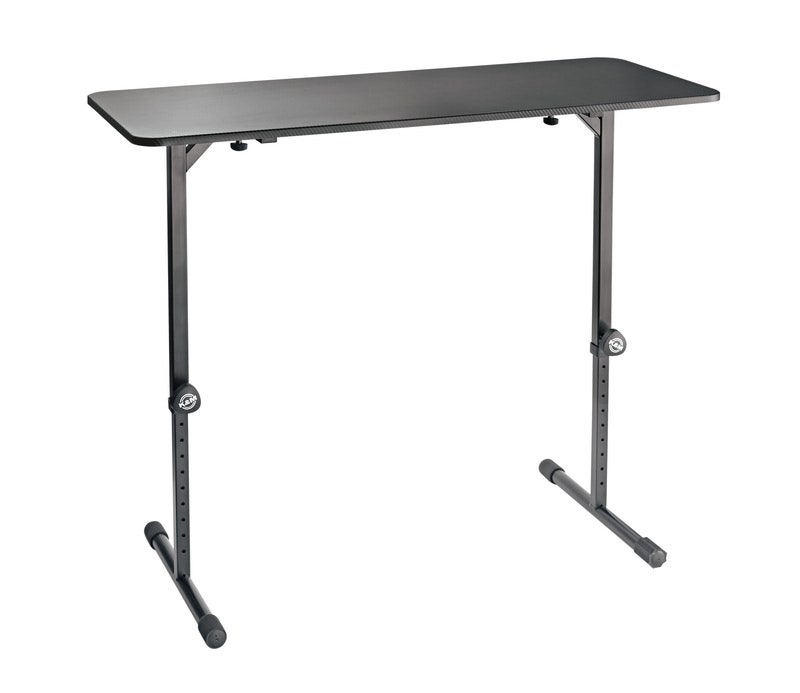 Professional DJ table for stationary and mobile use. The spacious tabletop with dimensions of 1100 x 455 mm provides room for a wide range of studio and DJ equipment. Thanks to the four quick-release clamps, the tabletop can be mounted or removed quickly and easily. The robust frame made of steel tubes provides the necessary stability. In addition, an adjustable end cap guarantees a wobble-free stand. The height can be adjusted in 30 mm steps from 605 to 1055 mm by means of spring-loaded locking bolts. For mobile use, the two base frames and the support tubes can be dismantled and, together with the frame and the top, offer a flat and user-friendly package.