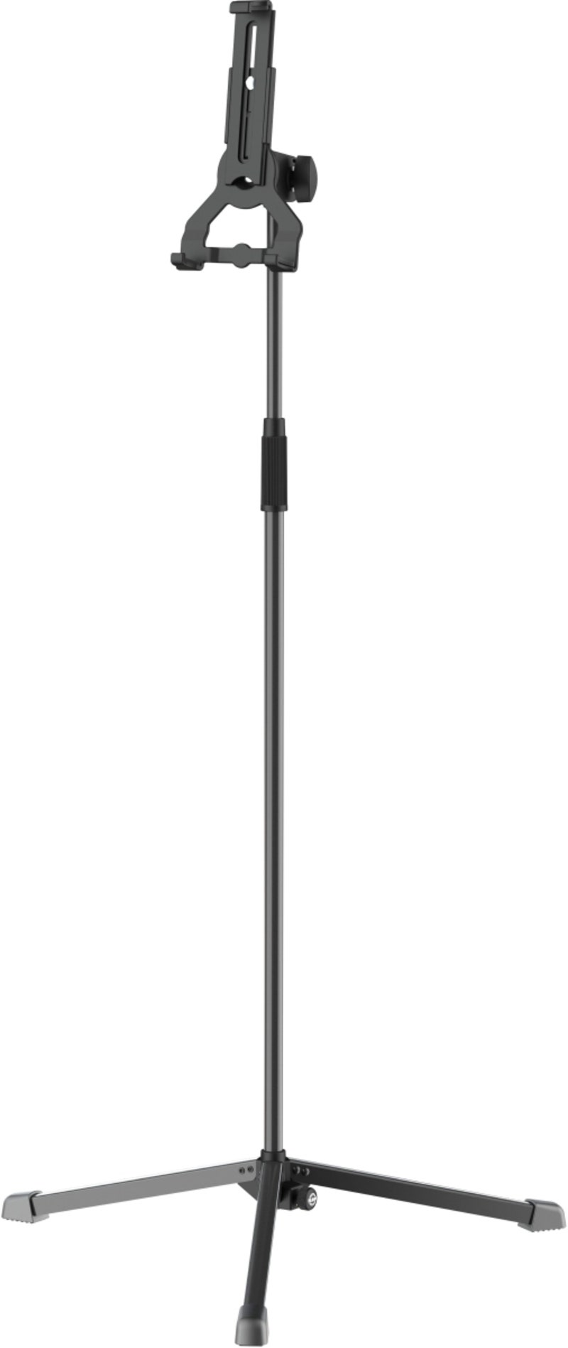 Golvstativ med ben i U-profil, steglös höjdjustering ocj en justerbar universalhållare för surfplattor.