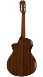 Our nylon-string Grand Concert 312ce-N balances sapele’s bright and focused tone with the naturally mellow flavors of the nylon sound. This makes a great choice for players who favor the comfort of a small-body acoustic and crave modern steel-string features like a cutaway and an onboard pickup on a nylon-string guitar. Additional details include a 1-7/8-inch neck, black binding, Italian acrylic small diamond fretboard inlays, and a 3-ring rosette. The guitar incorporates a Venetian cutaway for easy access to the upper register, comes equipped with Taylor’s ES-N pickup for great amplified tone, and ships in a Taylor deluxe hardshell case.