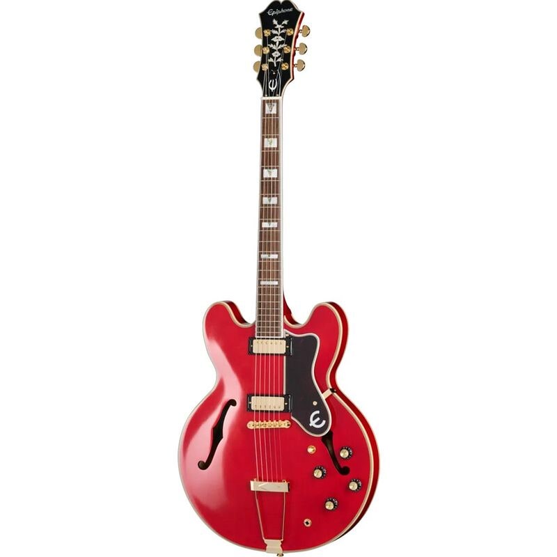 All hardware är guldfärgad och matchar den eleganta Vintage Gloss-finishen. Grover Rotomatic-stämskruvar med Milk Bottle-knappar och Graph Tech-sadel hjälper till att hålla stabil stämning, medan ABR-1-stall och Casino M-style raised diamond trapeze tailpiece ger klassisk känsla och respons. Epiphone hardshell-case ingår för trygg transport.