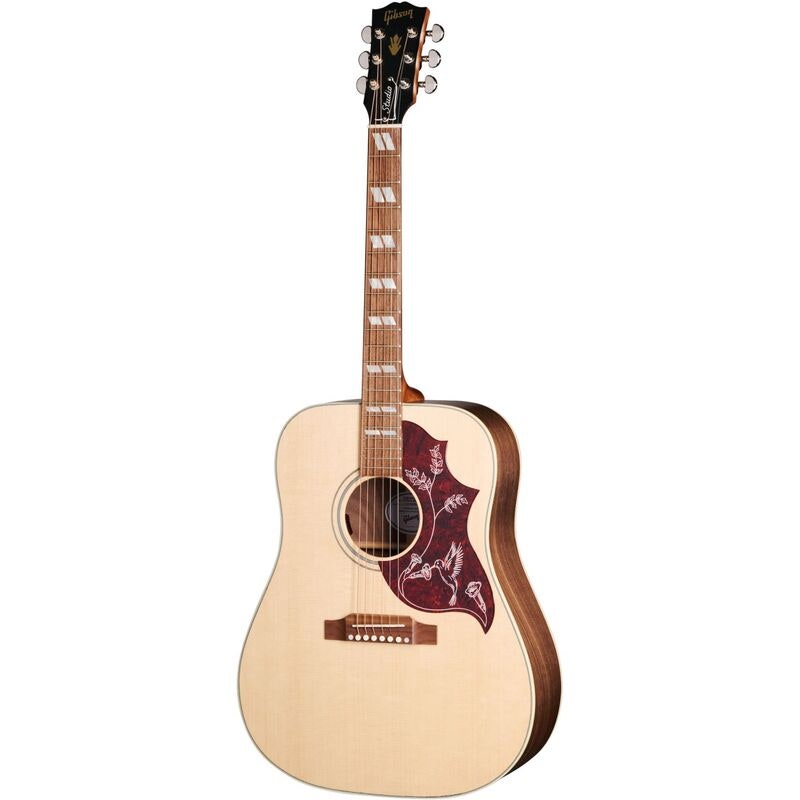 Den fullstora kroppen ger rik resonans och stark projektion. Halsen i utile (afrikansk mahogny) har Gibsons Advanced Response-profil, som erbjuder bekväm spelbarhet för både ackordspel och fingerspel. Greppbrädan i valnöt har 20 band, 16” radie och de klassiska pärlemorinläggen i parallellogramform – ett kännetecken för Hummingbird-serien. Den naturliga nitrocellulosafinishen ger en elegant och organisk känsla.