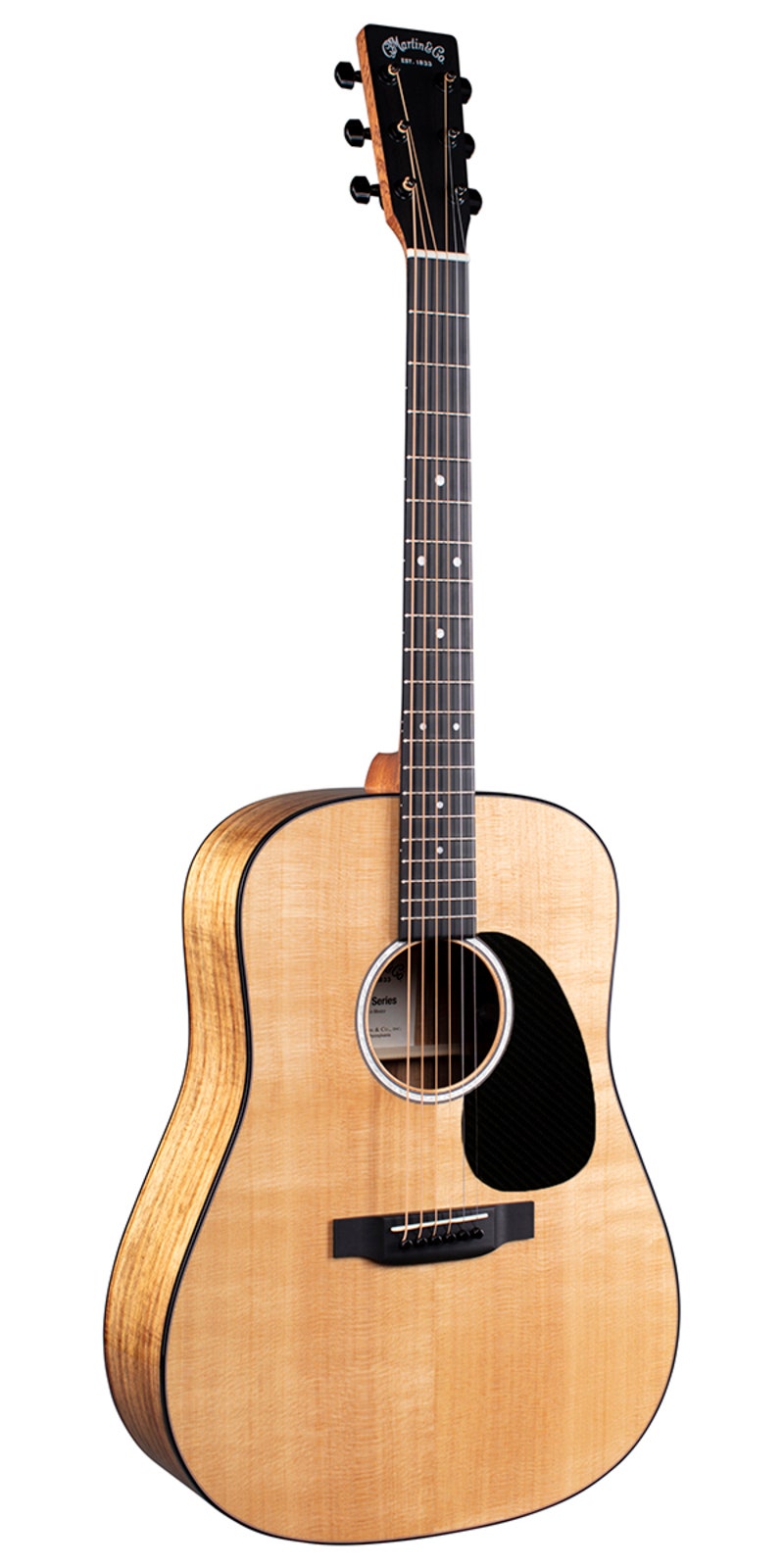 En dreadnought av klassiskt snitt med ett solitt lock i gran och där backstycket och sidorna är tillverkade i koa. Greppbräda, stall är tillverkat i FSC® Certified Richlite® och D12E har en Fishman MX-T preamp med inbyggd stämapparat och kontroller för ton och volym.