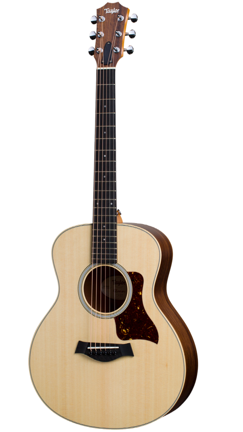 "En sann branschlegend, och den mest säljande akustiska gitarren under de senaste 20 åren, möjligen genom tiderna, GS Mini-familjen har tagit världen med storm med sin spelbarhet och sitt stora ljud, trots sin lilla kropp. En nerskalad version av Taylors stora Grand Symphony (GS) kroppsform. Med laminerade sidor och botten i Rosewood för ökad volym, och med en frodig Sitka gran-topp, som ger en tydlig och rik karaktär och med ett fint mellanregister. Med oöverträffad spelkomfort, oavsett var inspirationen slår till, oavsett om du sitter i soffan så är detta den ultimata gitarren för att passa in när du är på en resa, scenen, studion, på stranden eller varstans när du skriver dina låtar. "