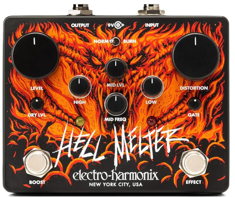 EHX Hell Melter har separata Gain- och Level-kontroller, en aktiv parametrisk EQ. Dry Level-kontrollen låter dig blanda in din rena signal för att att få ut mer botten ut pedalen om den används med t.ex en bas eller rent av tillsammans med andra distpedaler.