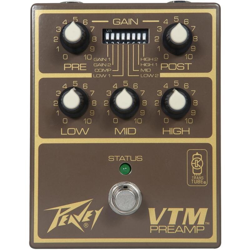 Artikelnummer 1089273Preamp Pedal, Baserad på Peavey VTM 60/120, Pre- och Post gain-kontroller, 3-bands EQ, 8 dip-switchar for Custom Response-inställningar, True Bypass