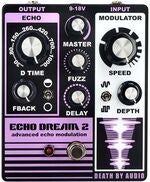The Echo Dream 2 is an updated version of one of Death by Audio?s most popular pedals, delivering 20 to 1,200 milliseconds of great sounding echo, with fuzz, and fully controllable pitch shifting modulation, all in a single pedal. Controls for Delay Time, Feedback, and Delay mix give you a beautifully ethereal echo. Flip the Wet/Dry toggle for an adjustable blend of delay and dry signal up to a 50/50 mix, or an all effects signal for use with a mixed loop. Turn the Fuzz control for the full sweep of dirt from clear to overdrive to all out fuzz. Then adjust the modulation Speed and Depth for the perfect level of expansive, pitch-shifting color, and flip the toggle for sine or square wave operation. The Echo Dream 2 draws only 40 milliamps when used with any standard 9v battery, but we recommend any standard negative center 9vDC power supply that can deliver 18 volts for even better clarity, tone and headroom.
