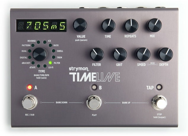 - Seven front-panel tone shaping knobs: Time, Repeats, Mix, Filter, Grit, Mod Speed, Mod Depth